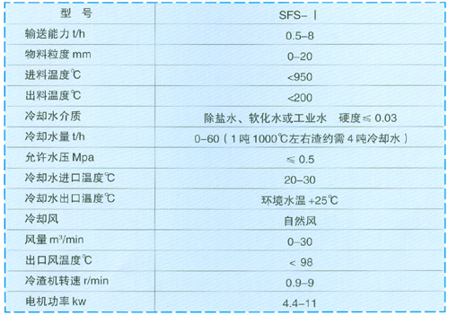 主要特点: SFS-I型冷渣机是我厂在九六年结合国外多种冷渣机的原理,在SLS型冷渣机的基础上研制而成,在SLS型冷渣机基础上具有以下特点: 1、结构、工艺简单,通过摩擦传动,功率低,任意调速,输送量大大增加。 2、输送物料与螺旋叶片的摩损小,运行平稳,噪音低。 3、冷却水的可选性高,系统简单,维护成本低。